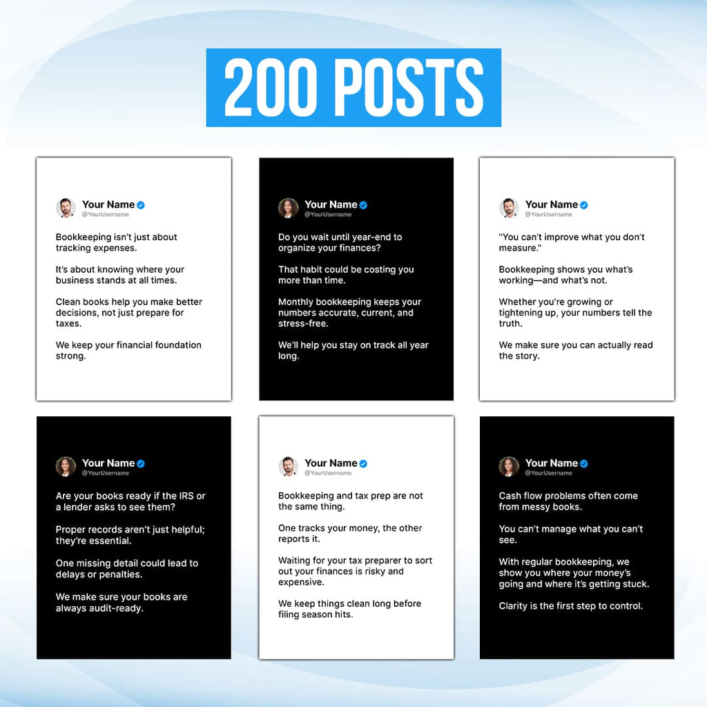 Your audience is on social media every day. The question is whether you are showing up consistently with content that positions you as the authority. With this package, you get 200 professionally written and designed social media images in a Twitter-style format that grabs attention, delivers value in seconds, and builds trust with potential clients.
